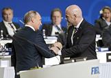 68-ой конгресс Международной федерации футбола (FIFA) прошле в Центральном выставочном комплексе(ЦВК) "Экспоцентр". Президент FIFA Джанни Инфантино (слева) и президент России Владимир Путин (справа) во время заседания конгресса.