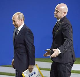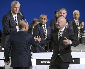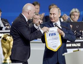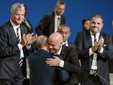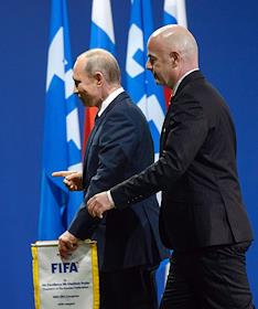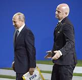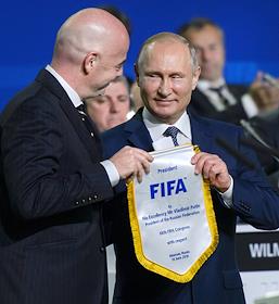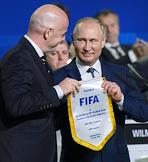 68-ой конгресс Международной федерации футбола (FIFA) прошле в Центральном выставочном комплексе(ЦВК) "Экспоцентр". Президент FIFA Джанни Инфантино (слева) и президент России Владимир Путин (справа) во время заседания конгресса.