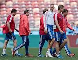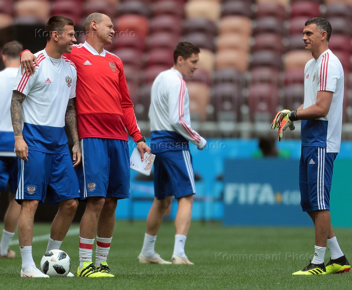 Чемпионат мира по футболу в России FIFA-2018. Открытая тренировка сборной команды России по футболу на стадионе "Лужники". Игрок сборной команды России Федор Смолов (слева) и тренер команды Мирослав Ромащенко (второй слева) во время тренировки.