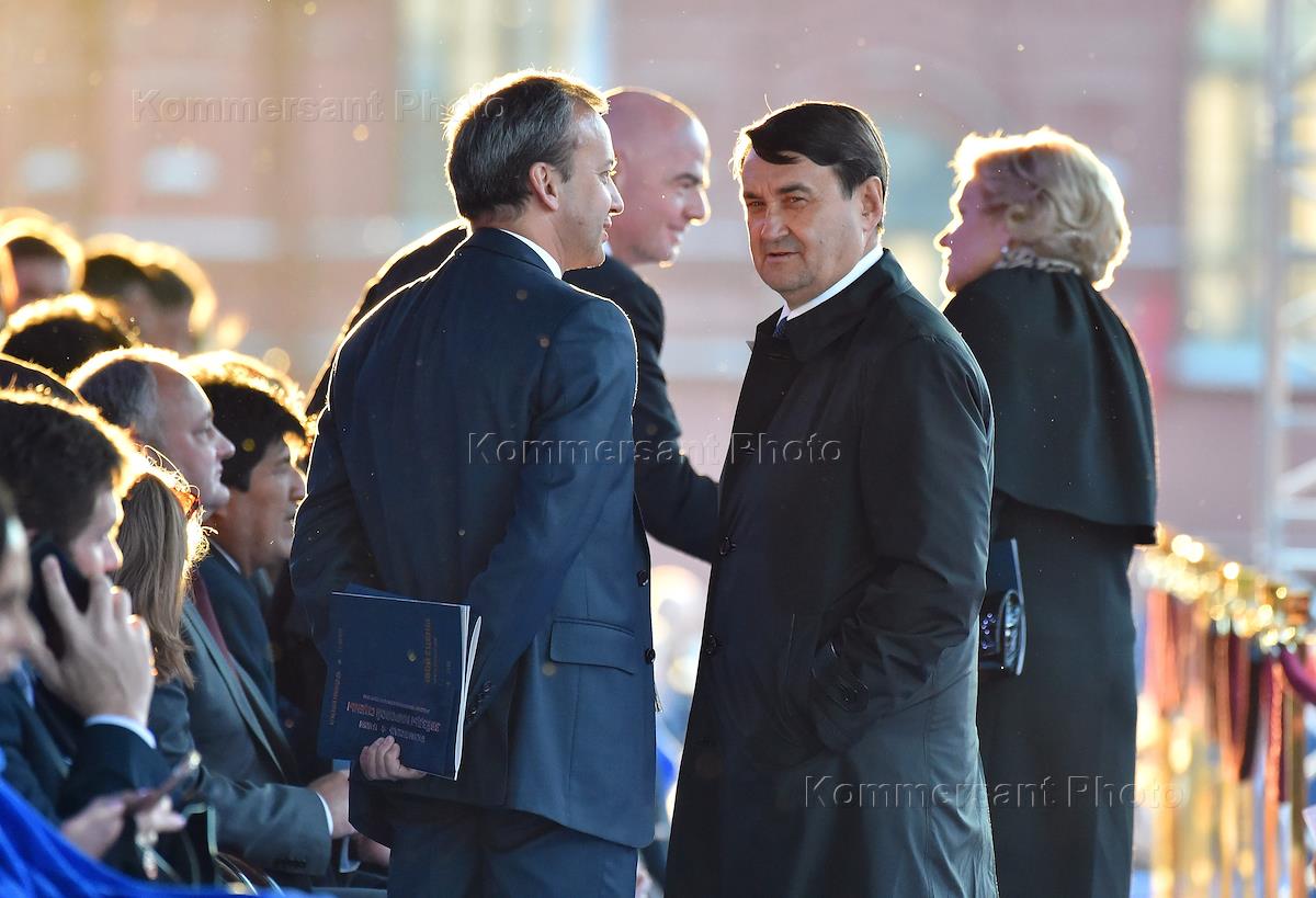 Гала-концерт мировых звезд классической сцены, посвященный открытию Чемпионата мира по футболу в России FIFA-2018, на Красной площади. Председатель АНО "Организационный комитет "Россия-2018" Аркадий Дворкович (слева) и помощник президента России Игорь Левитин (в центре) перед началом гала-концерта.