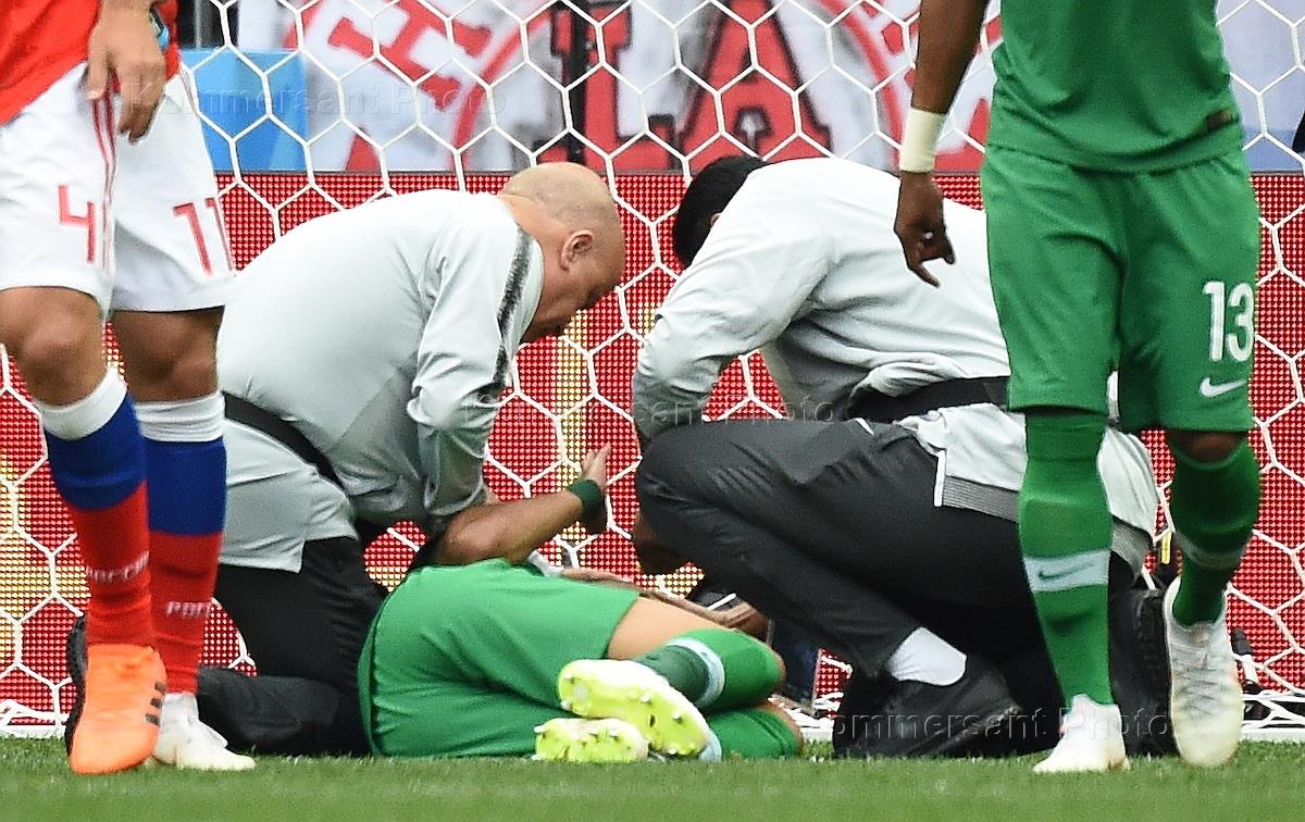 FIFA World Cup Russia 2018. Group A. Russia v Saudi Arabia at the stadium "Luzhniki". Saudi goalkeeper Abdullah Al-Mayouf (left) during the match.