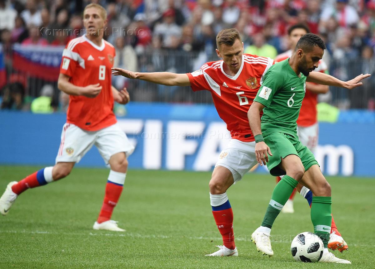 FIFA World Cup Russia 2018. Group A. Russia v Saudi Arabia at the stadium "Luzhniki". Russian football players Fyodor Kudriashov (left) and Yuri Gazinsky (center) with Saudi football player Salem Al-Dawsari (right) during the match.