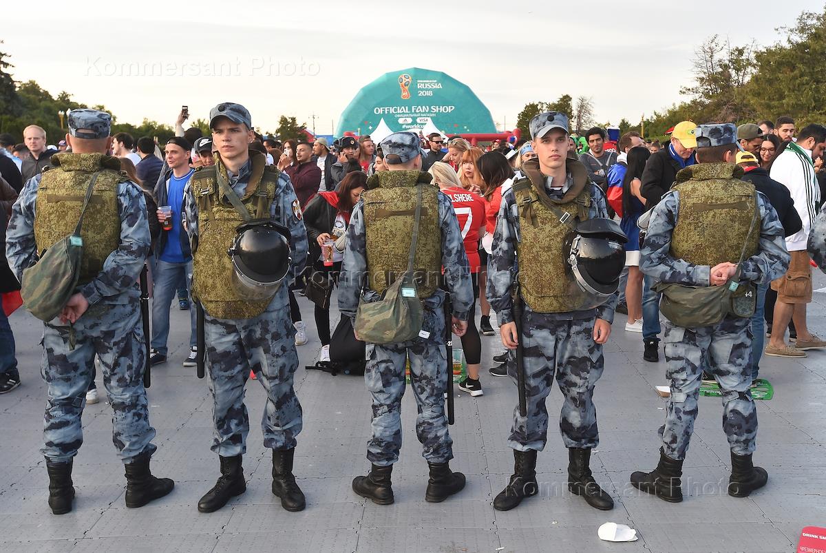 Чемпионат мира по футболу в России FIFA-2018. Матч открытие. Групповой этап. Матч между сборными командами России и Саудовской Аравии. Болельщики и сотрудники Росгвардии в Фан-зоне на Воробьевых горах.