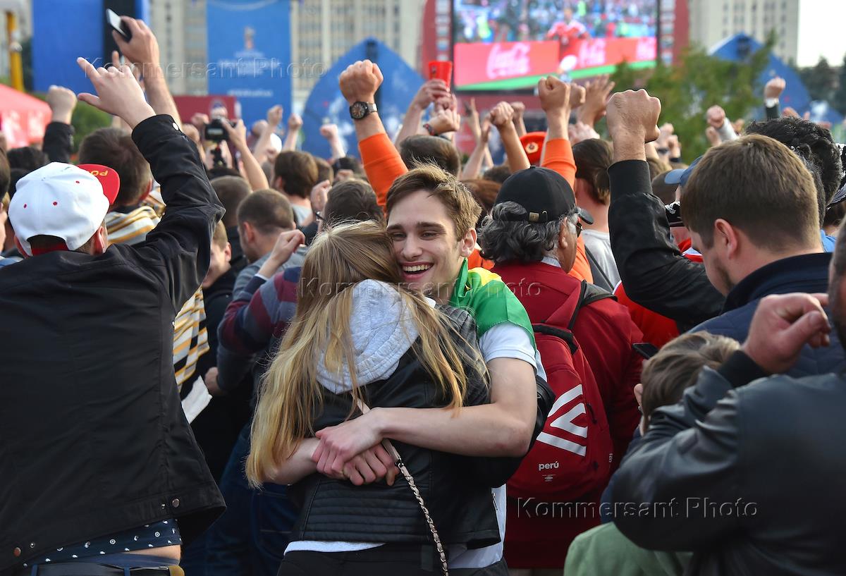 Чемпионат мира по футболу в России FIFA-2018. Матч открытие. Групповой этап. Матч между сборными командами России и Саудовской Аравии. Болельщики в Фан-зоне на Воробьевых горах.