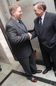 Первый заместитель генерального директора "Газпром-Медиа" Антон Иванов (слева) и председатель Высшего арбитражного суда России (ВАС РФ) Вениамин Яковлев (справа) на Международной конференции "Российский рубль: 15 лет на пути к свободной конвертируемости". Конференция прошла в "Президент-отеле".
