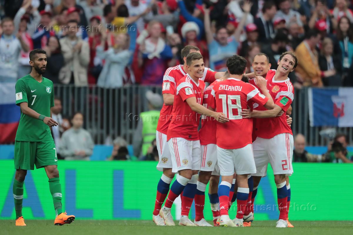 FIFA World Cup Russia 2018. Group A. Russia v Saudi Arabia at the stadium "Luzhniki". Russian football team from left to right: Roman Zobnin, Yuri Shirokov, Segrey Ignashevich and Mario Fernandez during celebration a goal.