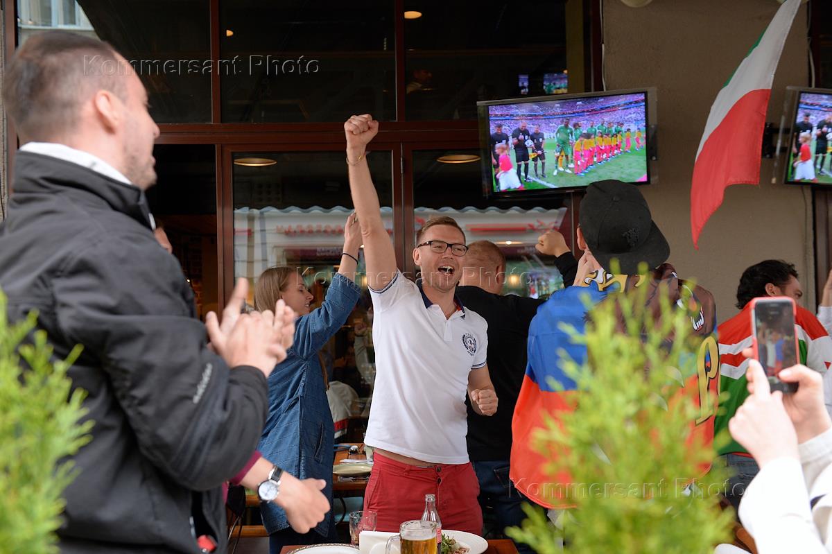 Чемпионат мира по футболу FIFA 2018. Матч открытие. Групповой этап. Матч между сборными командами России и Саудовской Аравии. Болельщики смотрят матч в барах Москвы.