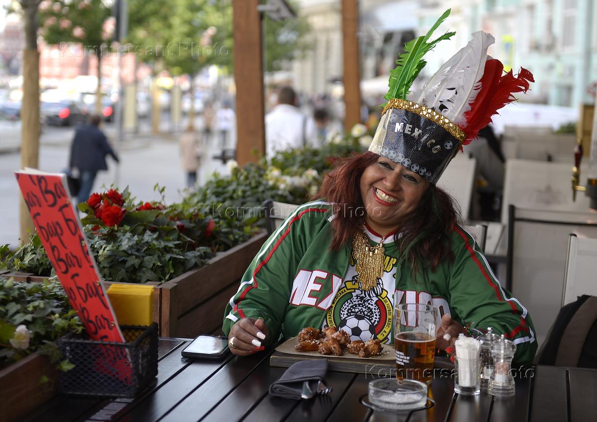 Чемпионат мира по футболу в России FIFA-2018. Матч открытие. Групповой этап. Матч между сборными командами России и Саудовской Аравии. Болельщики смотрят матч в барах Москвы. Болельщица сборной Мексики.
