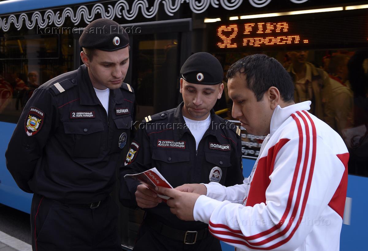 Чемпионат мира по футболу в России FIFA-2018. Сотрудники полиции помогают иностранному болельщику.