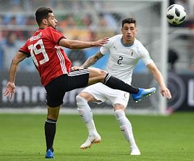 Чемпионат мира по футболу. Групповой этап. Матч между сборными Египта и Уругвая на стадионе "Екатеринбург Арена". Игрок сборной Уругвая Хосе Хименес (справа) во время матча.