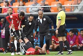 Чемпионат мира по футболу в России FIFA-2018. Групповой этап. Матч между сборными Египта и Уругвая на стадионе "Екатеринбург Арена". Игроки сборной Египта Трезеге (лежит) и Кахраба (слева) во время матча.