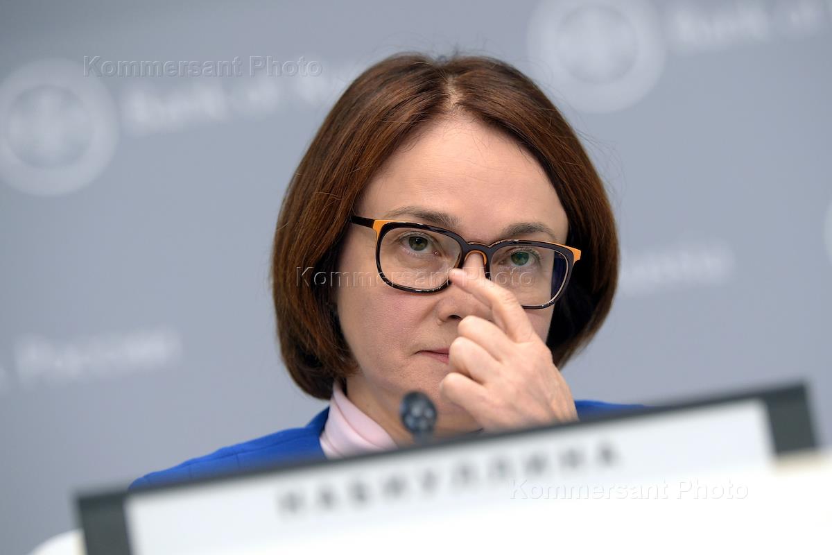 Председатель Центрального Банка России Эльвира Набиуллина во время пресс-конференци по итогам заседания Совета директоров Банка России. Пресс-конференция прошла в здании Центрального Банка России на Неглинной улице.