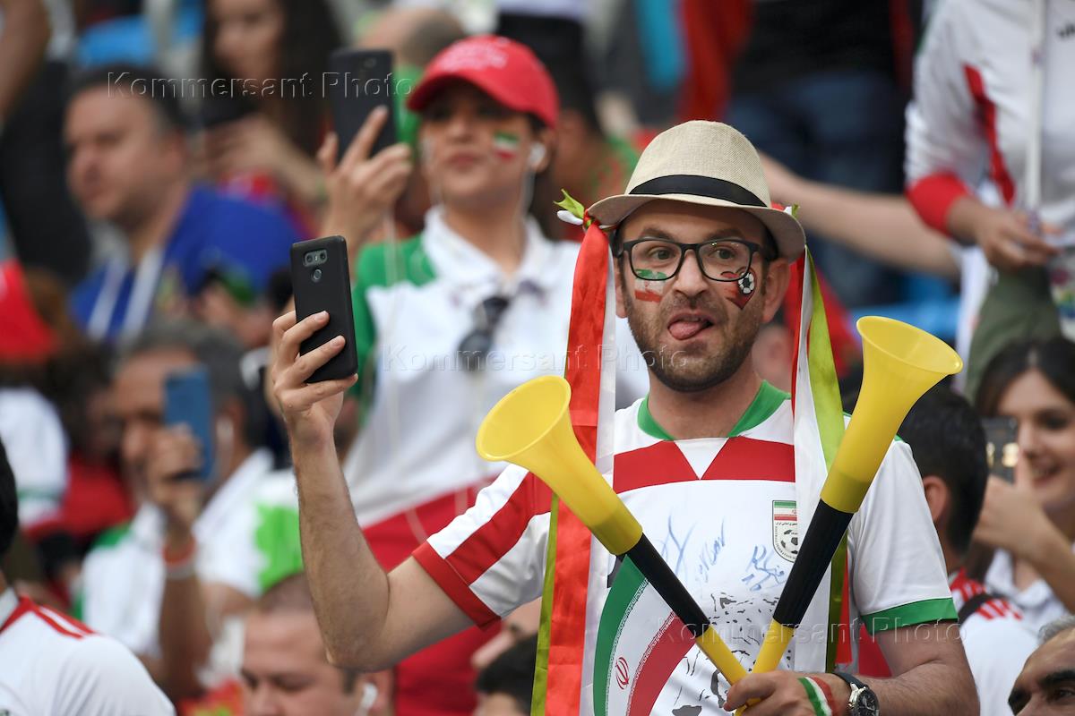 Чемпионат мира по футболу в России FIFA-2018. Групповой этап. Матч между сборными командами Морокко и Ирана на стадионе "Санкт-Петербург". Иранские болельщики на зрительской трибуне перед началом матча.