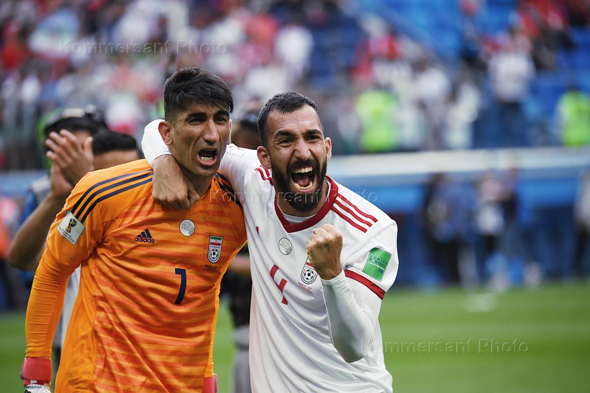 Чемпионат мира по футболу в России FIFA-2018. Групповой этап. Матч между сборными командами Марокко и Ирана на стадионе "Санкт-Петербург". Вратарь сборной Ирана Али Бейранванд (слева) и игрок сборной Ирана Рузбех Чешми (справа) во время матча.