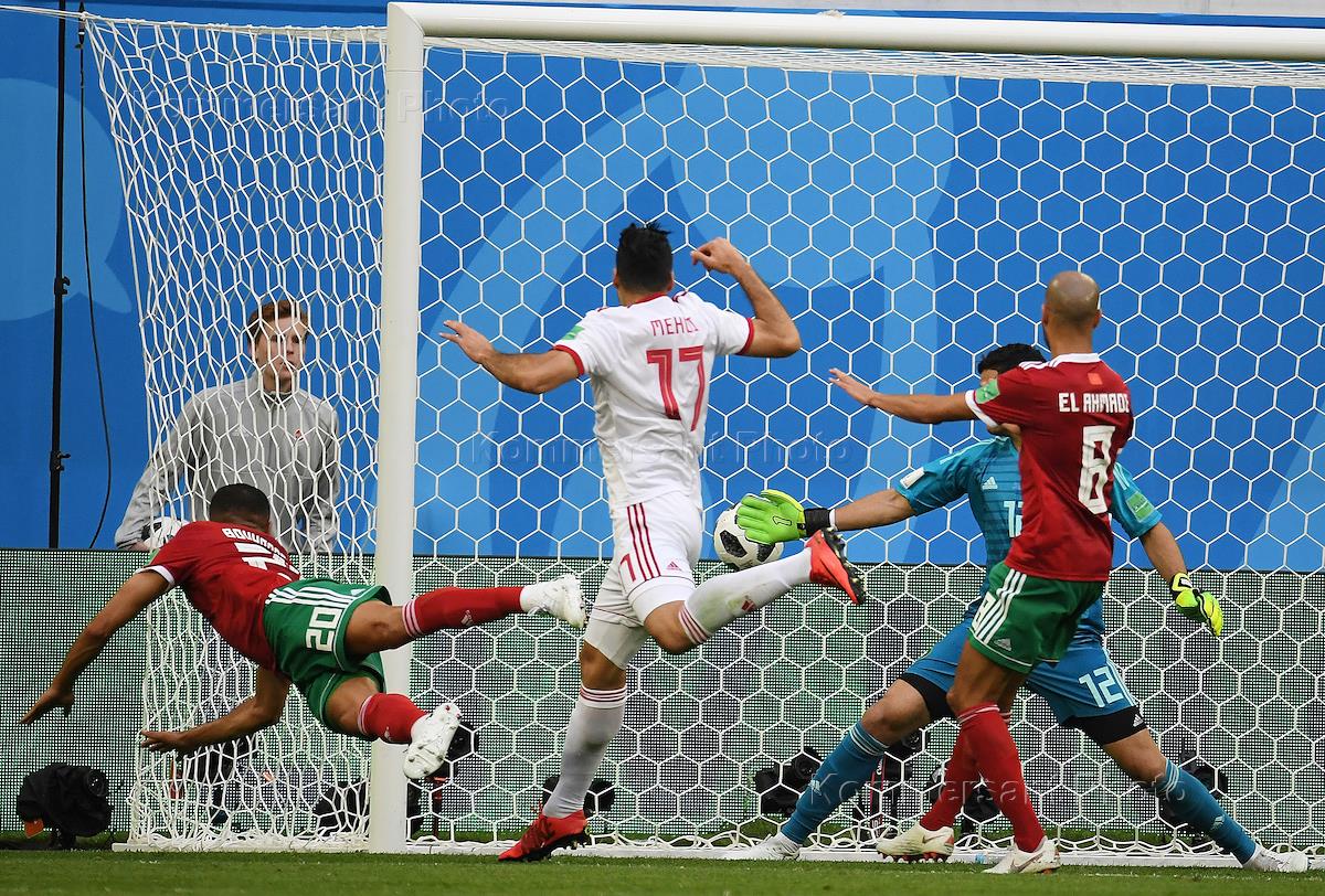 Чемпионат мира по футболу в России FIFA-2018. Групповой этап. Матч между сборными командами Марокко и Ирана на стадионе "Санкт-Петербург". Слева направо: игрок сборной Марокко Нуреддин Амрабат, вратарь сборной Марокко Мунир Эль-Кажуи и игрок сборной Ирана Сердар Азмун во время матча.