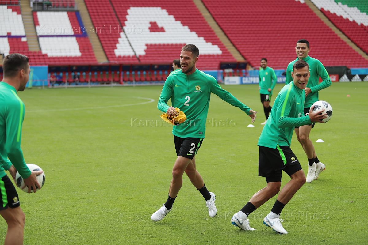 Чемпионат мира по футболу в России FIFA-2018. Групповой этап. Открытая тренировка сборной Австралии перед матчем группового этапа против сборной команды Франции. Игрок сборной Австралии Милош Дегенек (в центре) во время тренировки на стадионе "Трудовые резервы".