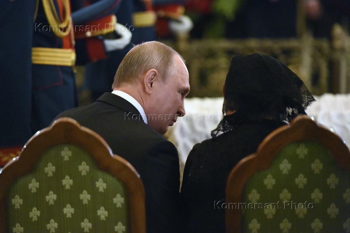 The farewell ceremony with the director, chairman of the State Duma of Russia Committee on Culture Stanislav Govorukhin was held in the Cathedral of Christ the Savior. Russian President Vladimir Putin (left) and Stanislav Govorukhin's widow Galina Govorukhina (right) during the ceremony.