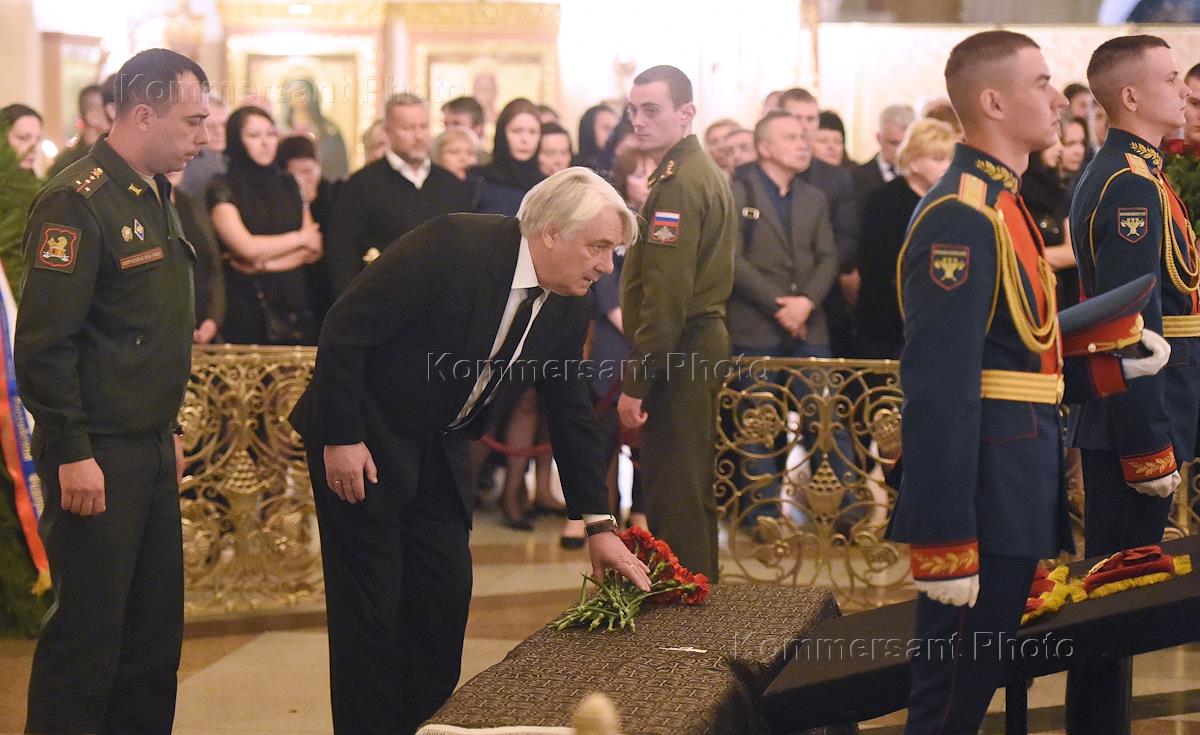Церемония прощания с режиссером, председателем комитета Государственной думы (ГД) России по культуре Станиславом Говорухиным прошла в храме Христа Спасителя. Член комитета ГД России по международным делам Артур Чилингаров (слева) во время церемонии.