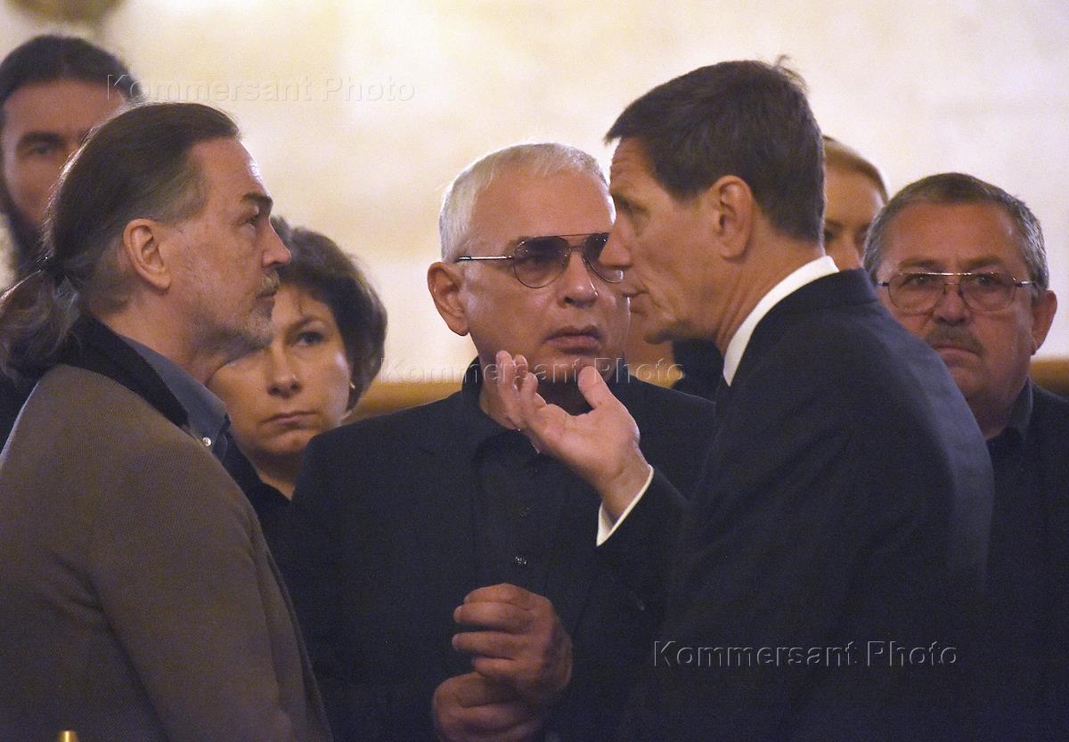 Церемония прощания с режиссером, председателем комитета Государственной думы (ГД) России по культуре Станиславом Говорухиным прошла в храме Христа Спасителя. Актер Сергей Гармаш (слева) и директор Московского НИИ неотложной детской хирургии и травматологии Леонид Рошаль (справа) во время церемонии.