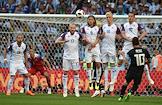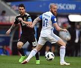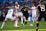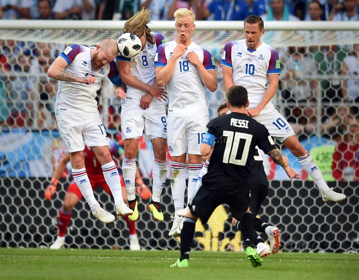 FIFA World Cup Russia 2018. Group D. Iceland v Argentina at the stadium "Spartak" . Iceland football player Emil Hallfredsson (second left) with Argentinianfootball player Lionel Messi (center) during the match.