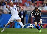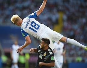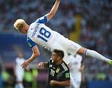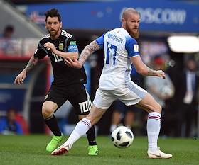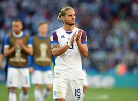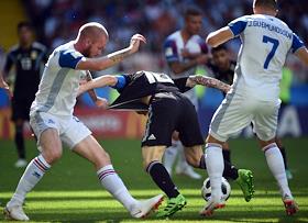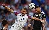 FIFA World Cup Russia 2018. Group D. Iceland v Argentina at the stadium "Spartak" . Iceland football player Johann Berg Gudmundsson (left) during the match.