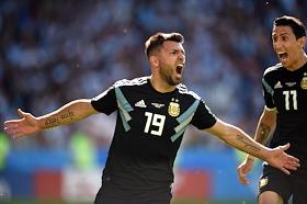 FIFA World Cup Russia 2018. Group D. Iceland v Argentina at the stadium "Spartak" . Argentinian football players Angel di Maria (right) and Sergio Aguero (left) during the match.