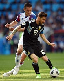 FIFA World Cup Russia 2018. Group D. Iceland v Argentina at the stadium "Spartak" . Argentinian football player Lionel Messi (right) with Iceland football player Emil Hallfredsson (left) during the match.