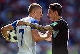IFA World Cup Russia 2018. Group D. Iceland v Argentina at the stadium "Spartak" . Iceland football player Kari Arnason (left) with Argentinian football player Kari Arnason (right) during the match.