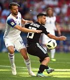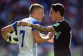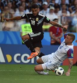 FIFA World Cup Russia 2018. Group D. Iceland v Argentina at the stadium "Spartak" . Argentinian football player Eduardo Salvio (left) and Icelandic football player Ragnar Sigurdsson (right) during the match.