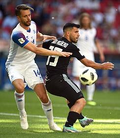 FIFA World Cup Russia 2018. Group D. Iceland v Argentina at the stadium "Spartak" . Argentinian football player Sergio Aguero (right) and Islandic football player Kari Arnason (left) during the match.