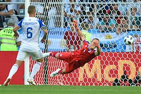 FIFA World Cup Russia 2018. Group D. Iceland v Argentina at the stadium "Spartak" . Iceland football player Ragnar Sigurdsson (left) and Hannes Halldorsson (right) during the match.