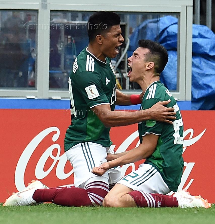 Чемпионат мира по футболу в России FIFA 2018. Групповой этап. Матч между сборными командами Германии и Мексики на стадионе "Лужники". Игроки сборной Мексики Хезус Гальярдо (слева) и Ирвинг Лосано (справа) во время матча.