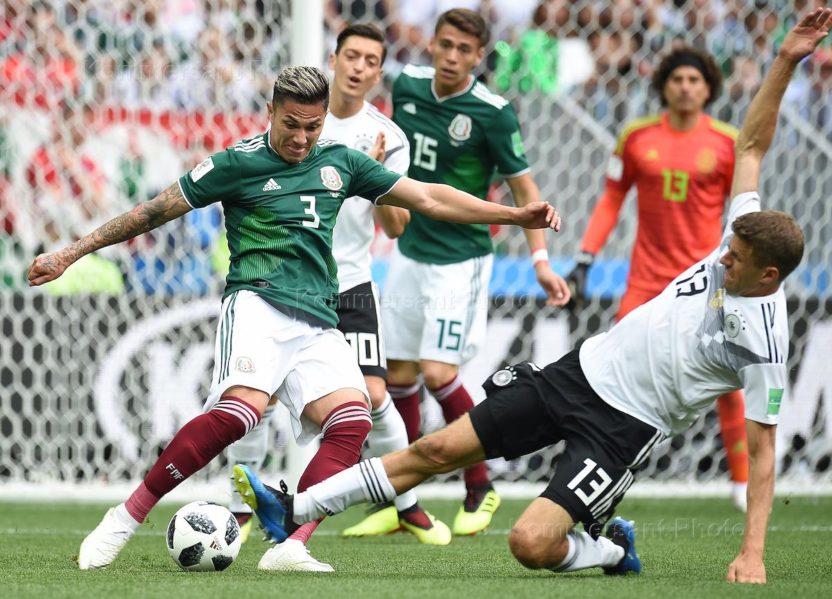Чемпионат мира по футболу в России FIFA 2018. Групповой этап. Матч между сборными командами Германии и Мексики на стадионе "Лужники". Игрок сборной Мексики Эктор Морено (слева) во время матча.