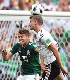 Чемпионат мира по футболу в России FIFA 2018. Групповой этап. Матч между сборными командами Германии и Мексики на стадионе "Лужники". Игрок сборной Германии Томас Мюллер (справа) и игрок сборной Мексики Карлос Сальседо (слева) во время матча.