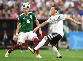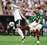 Чемпионат мира по футболу в России FIFA 2018. Групповой этап. Матч между сборными командами Германии и Мексики на стадионе "Лужники". Игрок сборной Германии Месут Озил (справа) и игрок сборной Мексики Эктор Эррера (слева) во время матча.