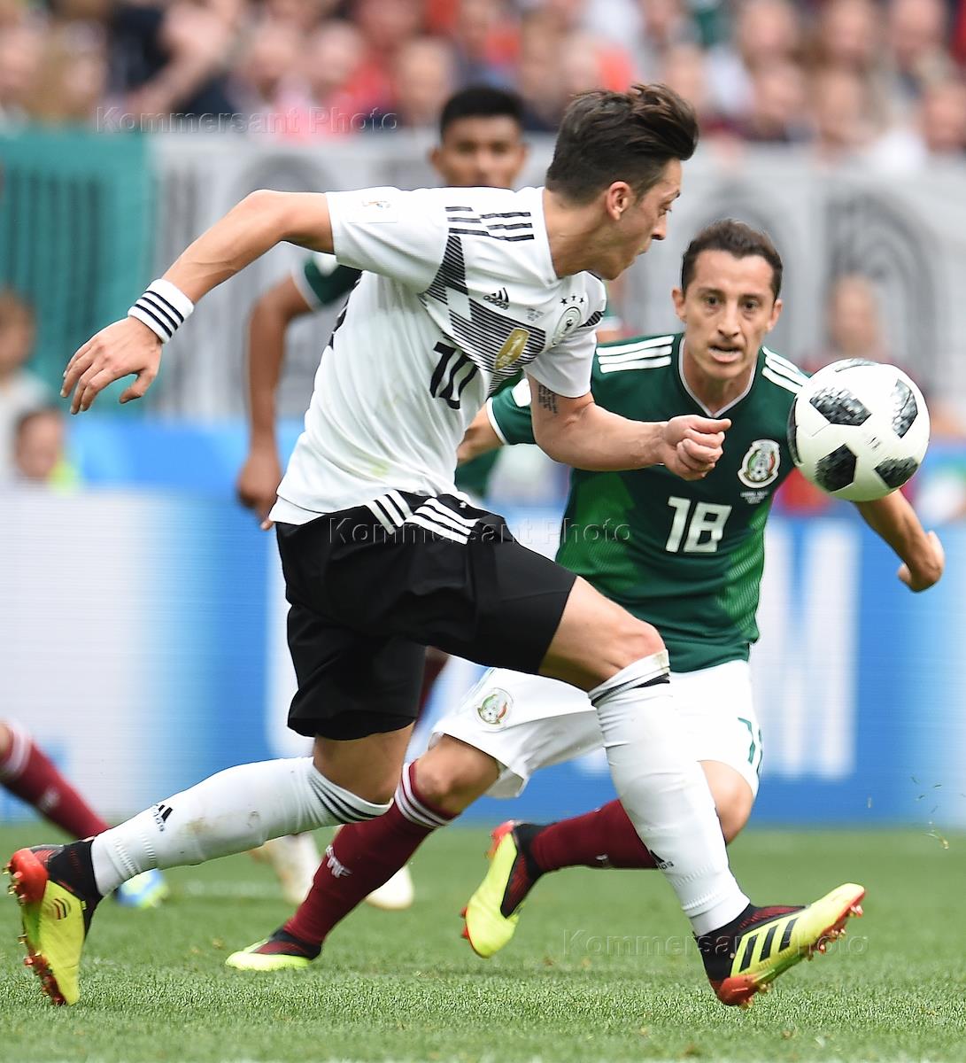 Чемпионат мира по футболу в России FIFA 2018. Групповой этап. Матч между сборными командами Германии и Мексики на стадионе "Лужники". Игрок сборной Германии Месут Озил (слева) и игрок сборной Мексики Андрес Гуардадо (справа) во время матча.