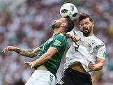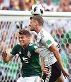 Чемпионат мира по футболу в России FIFA 2018. Групповой этап. Матч между сборными командами Германии и Мексики на стадионе "Лужники". Игрок сборной Германии Матс Хуммельс (слева) и игрок сборной Мексики Хавьер Эрнандес (справа) во время матча.