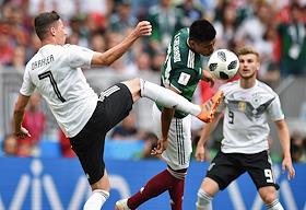 Чемпионат мира по футболу в России FIFA 2018. Групповой этап. Матч между сборными командами Германии и Мексики на стадионе "Лужники". Игрок сборной Германии Юлиан Дракслер (слева) и игрок сборной Мексики Карлос Сальседо (справа) во время матча.