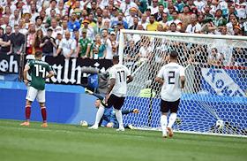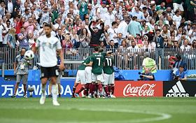 Чемпионат мира по футболу в России FIFA 2018. Групповой этап. Матч между сборными командами Германии и Мексики на стадионе "Лужники". Игроки сборной Мексики радуются забитому голу во время матча.