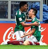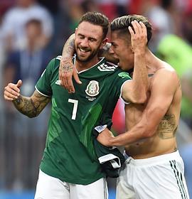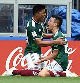Чемпионат мира по футболу в России FIFA 2018. Групповой этап. Матч между сборными командами Германии и Мексики на стадионе "Лужники". Игроки сборной Мексики Хезус Гальярдо (слева) и Ирвинг Лосано (справа) во время матча.