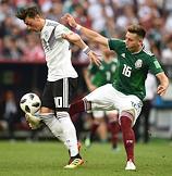 Чемпионат мира по футболу в России FIFA 2018. Групповой этап. Матч между сборными командами Германии и Мексики на стадионе "Лужники". Игрок сборной Германии Томас Мюллер (справа) и игрок сборной Мексики Эктор Эррера (слева) во время матча.