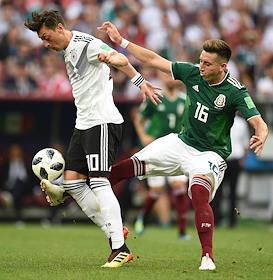 Чемпионат мира по футболу в России FIFA 2018. Групповой этап. Матч между сборными командами Германии и Мексики на стадионе "Лужники". Игрок сборной Германии Месут Озил (справа) и игрок сборной Мексики Эктор Эррера (слева) во время матча.