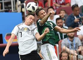 Чемпионат мира по футболу в России FIFA 2018. Групповой этап. Матч между сборными командами Германии и Мексики на стадионе "Лужники". Игрок сборной Германии Томас Мюллер (справа) и игрок сборной Мексики Эктор Морено (слева) во время матча.