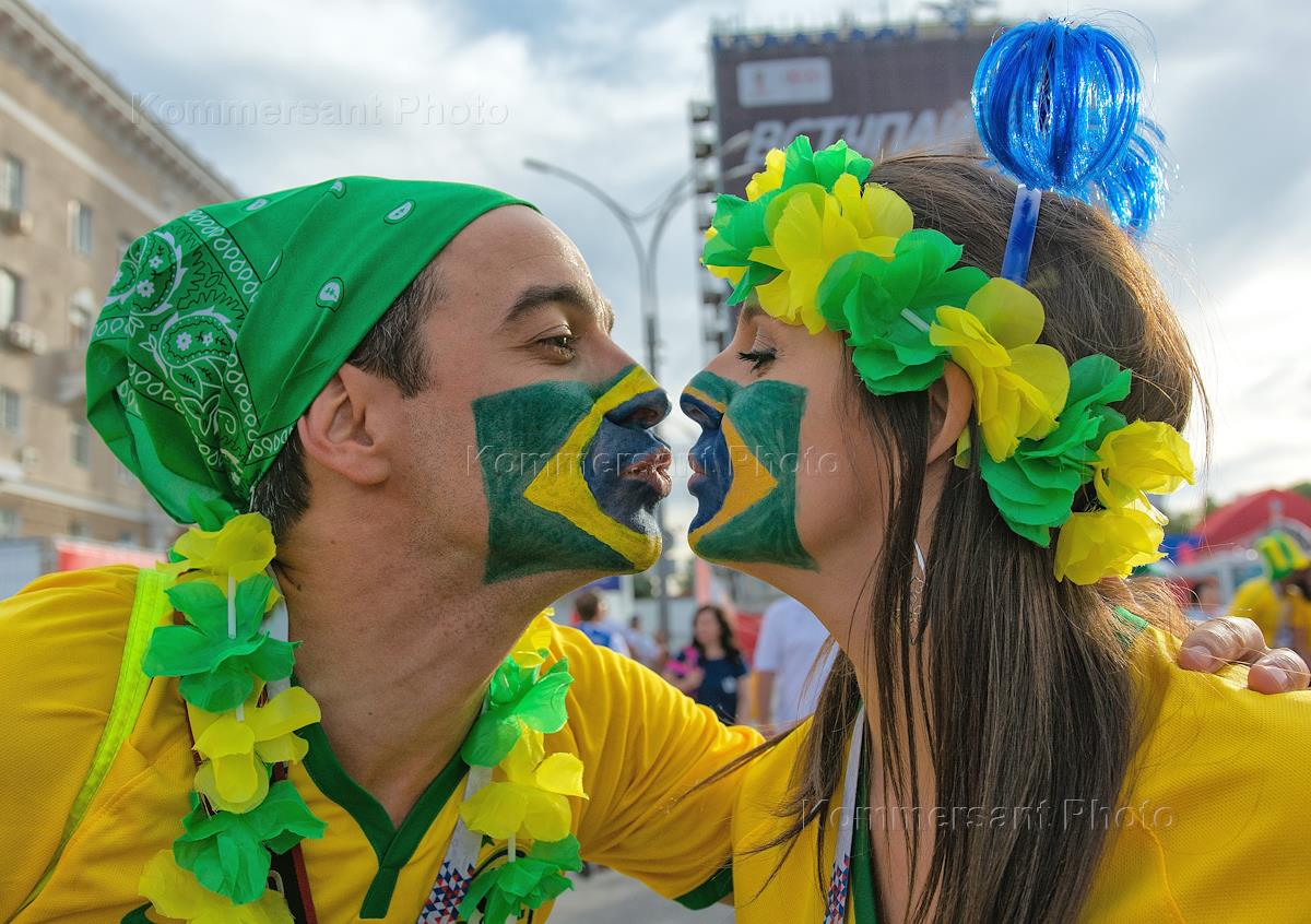 Чемпионат мира по футболу в России FIFA-2018. Футбольные болельщики из Бразилии в фан-зоне во время матча между сборными команлами Бразилии и Швейцарии.