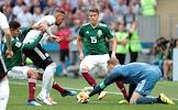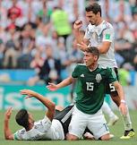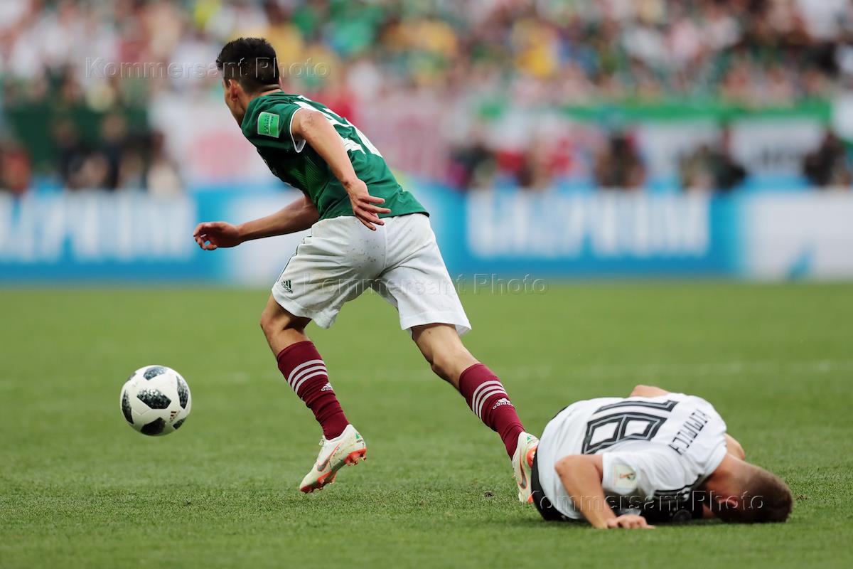 Чемпионат мира по футболу в России FIFA-2018. Групповой этап. Матч между сборными командами Германии и Мексики на стадионе "Лужники". Игрок сборной Мексики Эктор Эррера (в центре) во время матча.