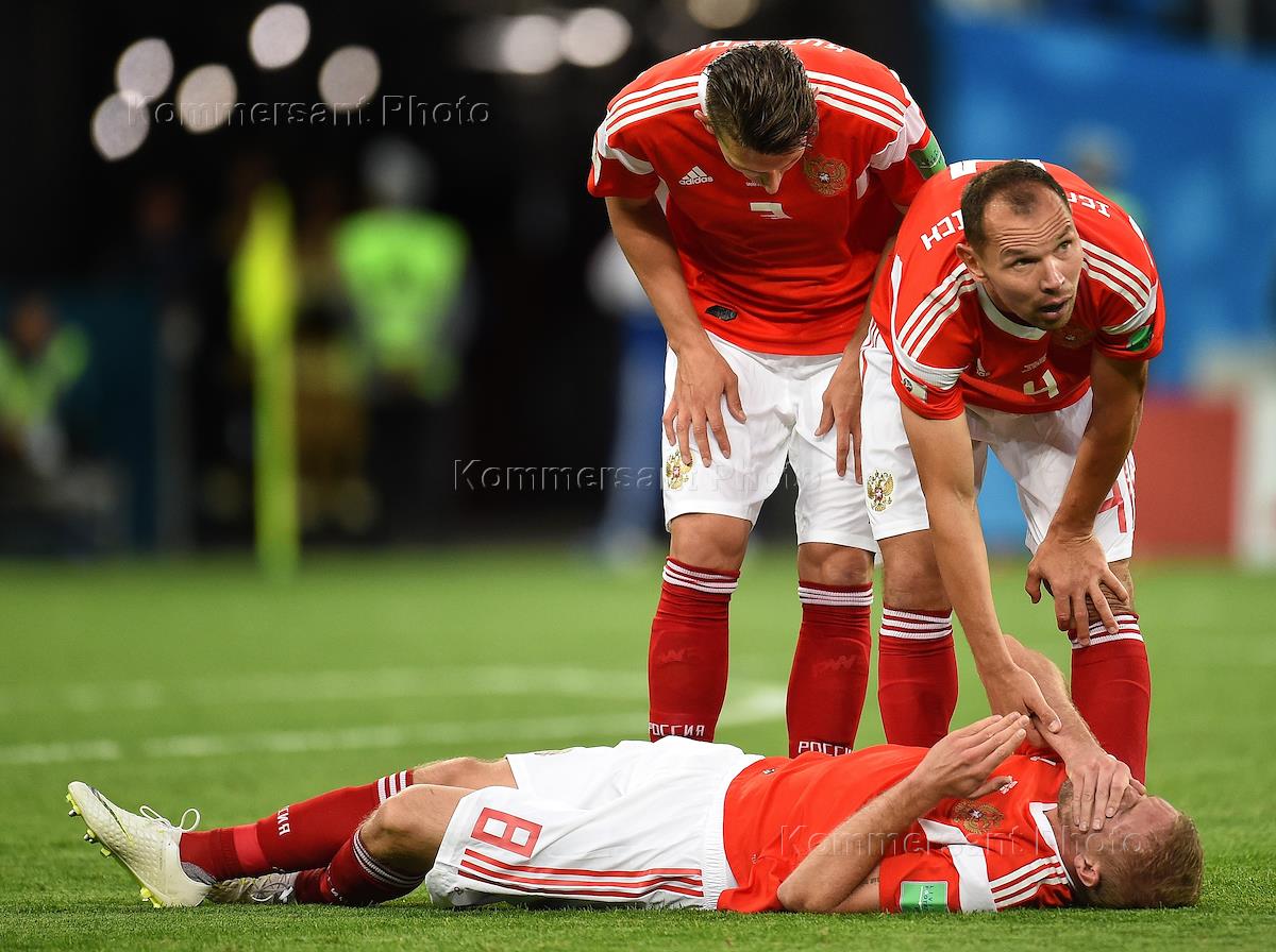 FIFA World Cup 2018 Russia. Group A. Russia v Egypt at the "Saint-Peterburg" stadium. Russian football players Roman Zobnin (left) and Sergey Ignashevich (center) during the match.