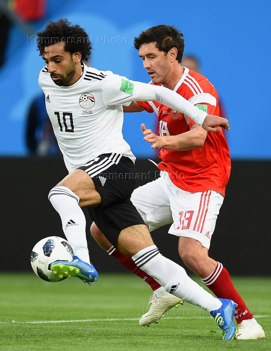 Чемпионат мира по футболу в России FIFA 2018. Групповой этап. Матч между сборными командами России и Египта прошел на стадионе "Санкт-Петербург". Игрок сборной России Юрий Жирков (слева) и игрок сборной Египта Мохамед Салах (справа) во время матча.