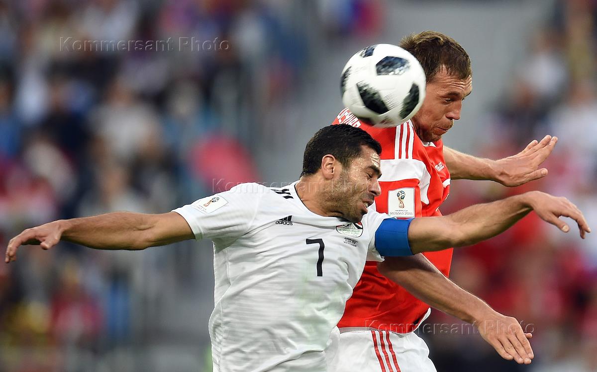 Чемпионат мира по футболу в России FIFA-2018. Групповой этап. Матч между сборными командами России и Египта на стадионе "Санкт-Петербург". Игроки сборной России Роман Зобнин (слева) и Сергей Игнашевич (в центре) во время матча.