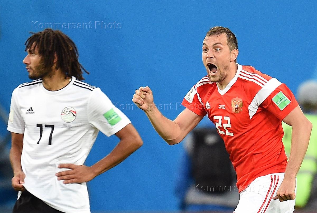 Чемпионат мира по футболу в России FIFA-2018. Групповой этап. Матч между сборными командами России и Египта на стадионе "Санкт-Петербург". Игрок сборной России Артем Дзюба (в центре) во время матча.