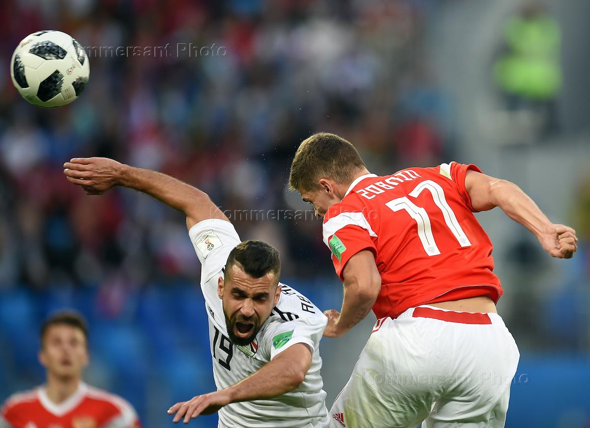 Чемпионат мира по футболу в России FIFA 2018. Групповой этап. Матч между сборными командами России и Египта прошел на стадионе "Санкт-Петербург". Игрок сборной России Александр Самедов (слева) и игрок сборной Египта Тарик Хамед (справа) во время матча.